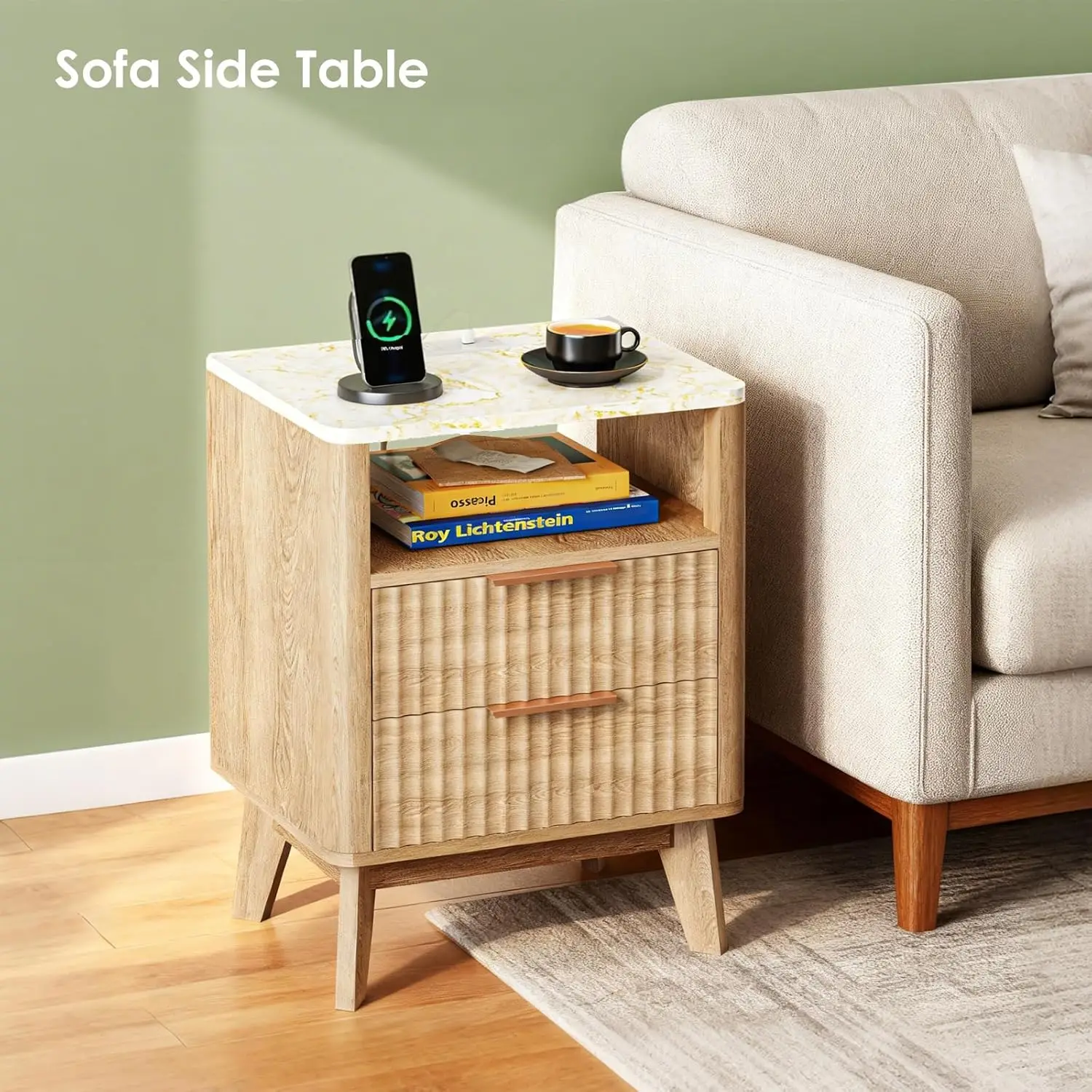 Fluted Nightstand with Charging Station, 2 Wood Drawers, Faux Marble Top